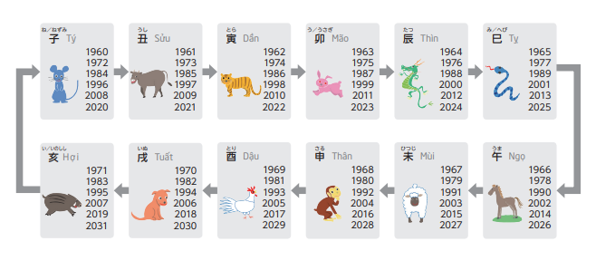 Ở đất nước của bạn, việc hỏi tuổi người khác có phổ biến không? Hay làm như vậy là thất lễ? Có nền văn hóa thật ngạc nhiên khi không được hỏi tuổi người khác, đặc biệt là hỏi tuổi phụ nữ. Nhưng cũng có nền văn hóa mà việc thoải mái hỏi tuổi, dù nữ giới hay nam giới là bình thường. Ở Nhật Bản, một số người nghĩ rằng việc hỏi tuổi là thất lễ, nhưng cũng có người cho rằng hỏi tuổi là điều rất bình thường. So với các nền văn hóa mà việc hỏi tuổi là cấm kỵ thì ở Nhật Bản, bạn có thể sẽ được hỏi tuổi khá thường xuyên. Lý do là vì việc phân biệt "người bề trên" và "người dưới" theo tuổi tác có ý nghĩa mang tính xã hội. Và trong tiếng Nhật có phân biệt cách dùng từ vựng tùy theo người bề trên, người dưới hay bằng tuổi. Tùy theo khu vực hoặc thế hệ có thói quen khác nhau, nhưng bạn nên lưu ý việc thỉnh thoảng được hỏi tuổi ở Nhật Bản. Nếu không muốn trả lời tuổi thật khi được hỏi, bạn có thể nói đùa là "Bí mật" hay " Tôi mãi 18 tuổi" hoặc đánh trống lảng bằng cách hỏi ngược lại như: "Nhìn tôi bao nhiêu tuổi?". Việc hỏi tuổi trực tiếp là thất lễ, nhưng đôi khi hỏi can chi (12 con giáp) khi muốn biết tuổi của đối phương. Can chi là khái niệm bắt nguồn từ Trung Quốc, phân công 12 con vật theo thứ tự mỗi năm. "Bạn sinh năm gì" là câu hỏi về can chi. Vì năm cùng con giáp cứ 12 năm lại có 1 lần nên từ đó có thể suy đoán được sinh vào năm dương lịch nào khi hỏi can chi năm sinh. Dưới đây là bảng đối chiếu năm dương lịch và can chi. Với người không biết can chi của mình thì hãy nhớ mình sinh ra vào năm nào.