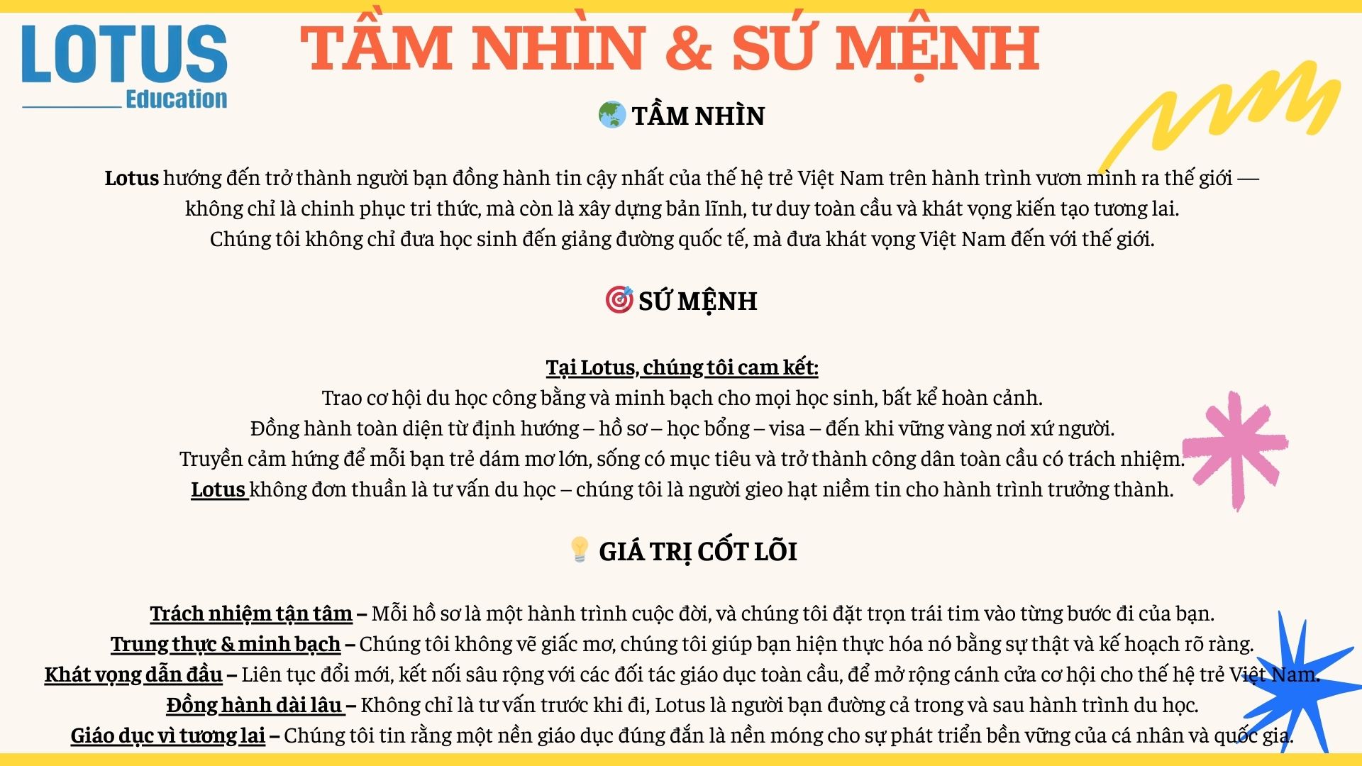 Tại Lotus Education, chúng tôi tin rằng mỗi hành trình du học không chỉ là con đường học vấn mà còn là bước ngoặt thay đổi cuộc đời. Vì vậy, Lotus Education luôn nỗ lực: